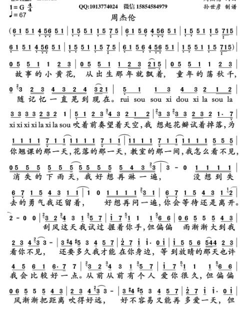 晴天简谱歌词词:周杰伦曲:周杰伦编曲:周杰伦故事的小黄花从出生那年
