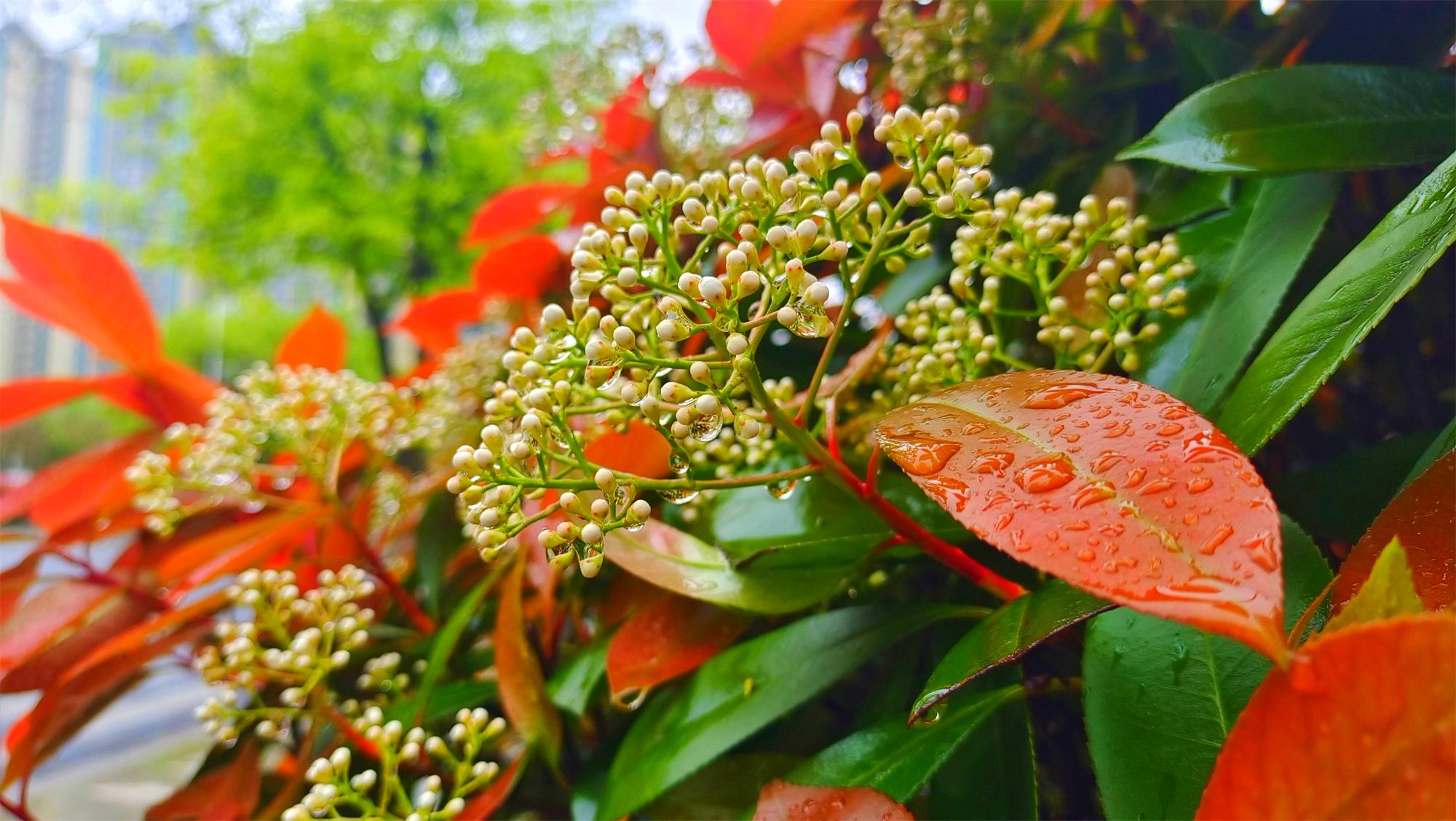 美丽吉安春雨中即将绽放的石楠花