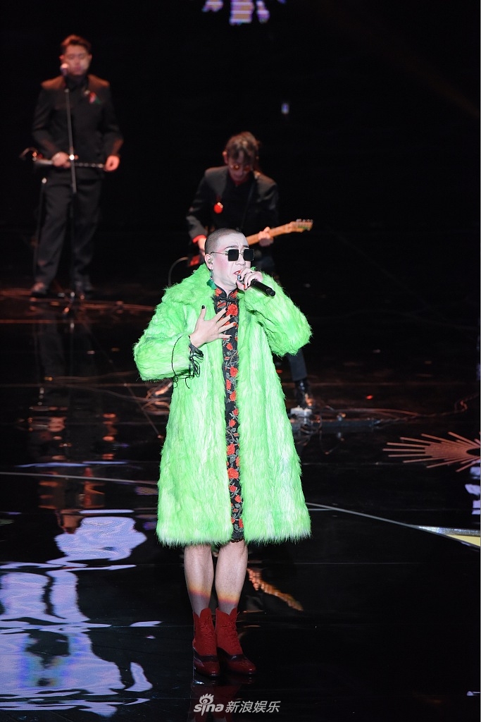 组图:二手玫瑰主唱梁龙献唱 旗袍女装搭配荧光皮草造型出位_高清图集_