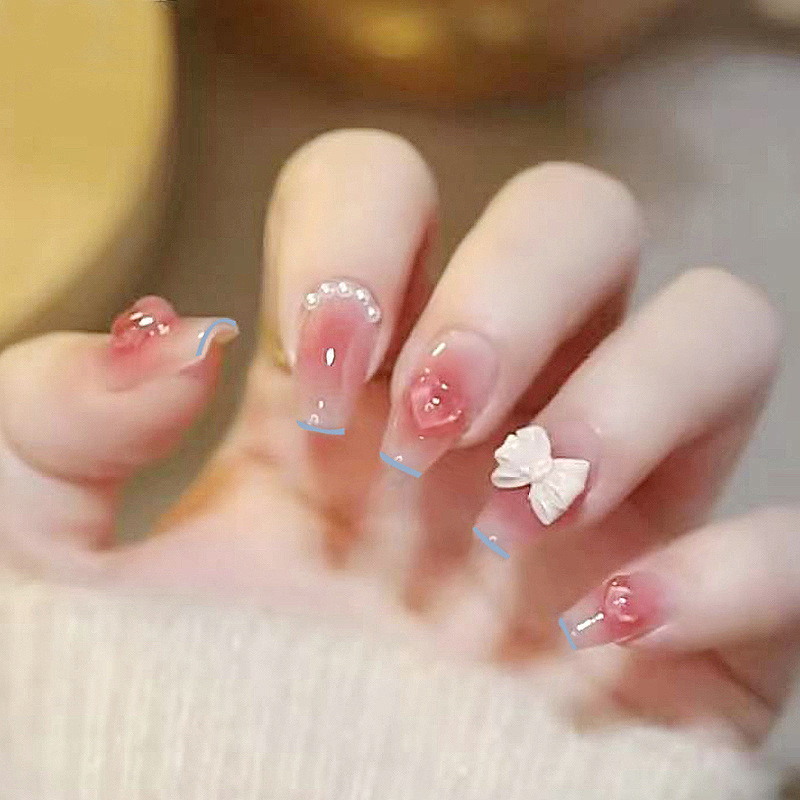 美甲贴片穿戴甲纯欲风腮红珍珠蝴蝶结中长款学生指甲贴成品假指甲
