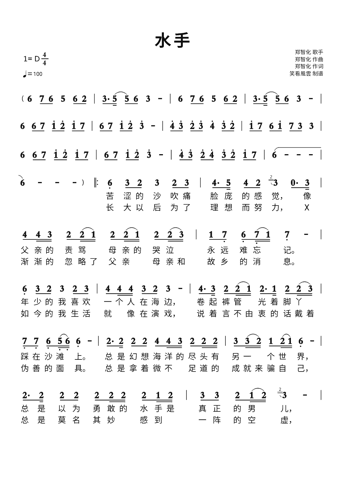 郑智化水手简谱_简谱_歌词曲谱