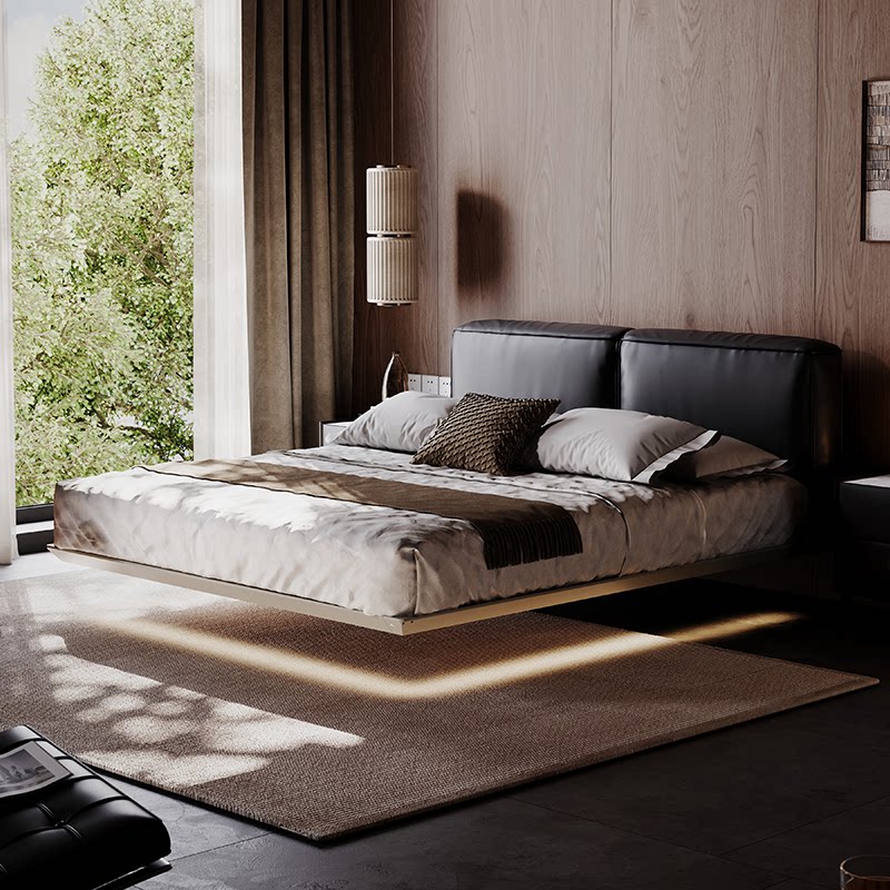 意式真皮悬浮床轻奢现代简约诧寂风主卧实木软靠双人齐边床小户型