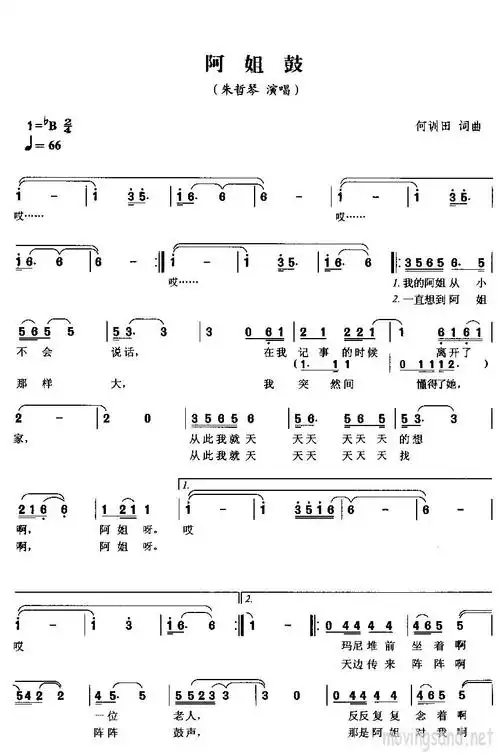 中国名歌《阿姐鼓》歌曲简谱 - 乐器教程网