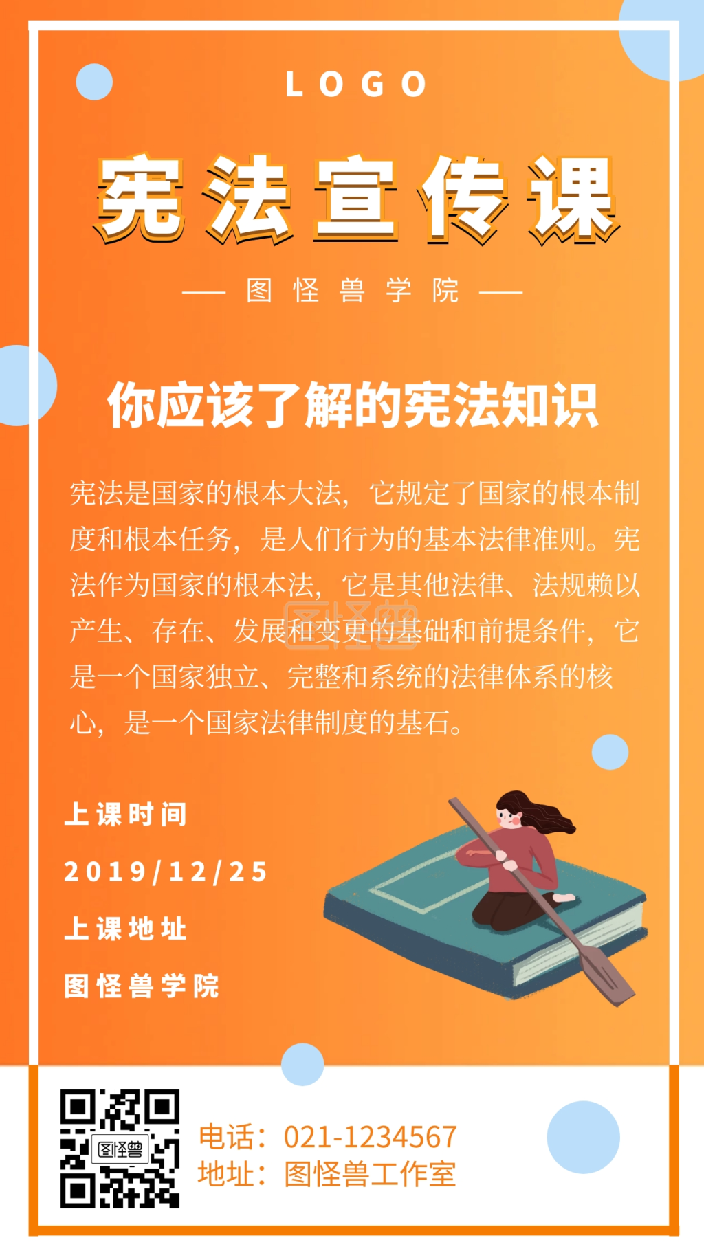 橙色卡通宣传宪法手机海报