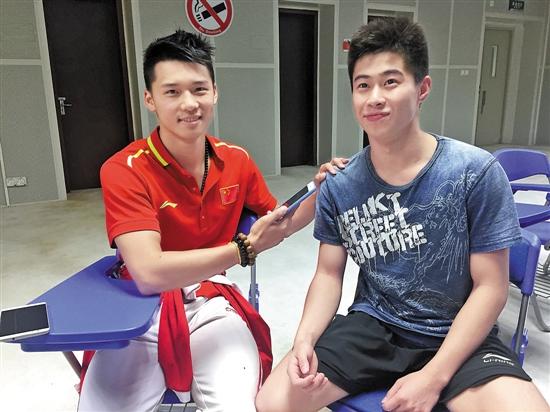 陈艾森(左)在采访队友,与恒大名将同名的黄博文 苏荇 摄
