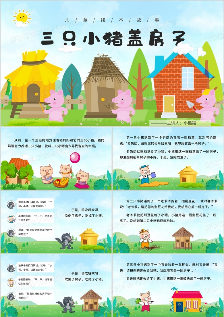 卡通绘本故事三只小猪盖房子ppt模板,ppt文件:wzppt(加个点)com