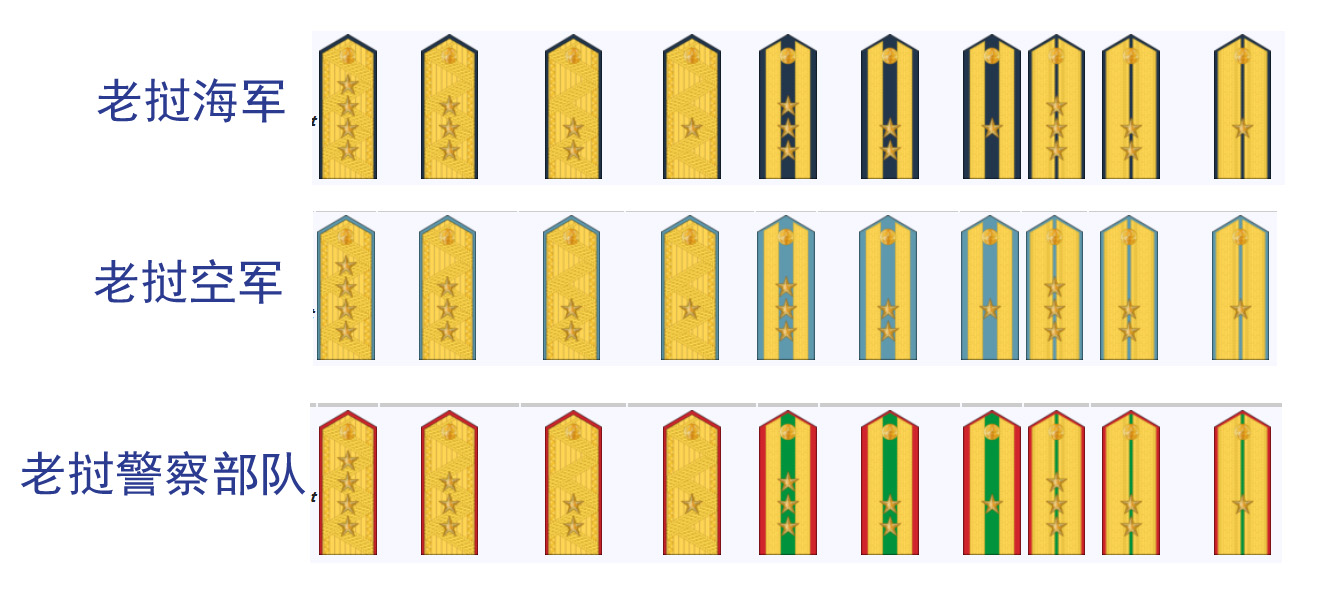老挝人民军士兵军衔区分为中士,下士,上等兵,列兵,肩章标志是红牌加