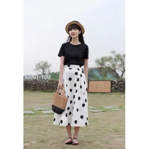 鹿向南白色波点半身裙女高腰显瘦今年流行裙子中长款a字裙子夏季