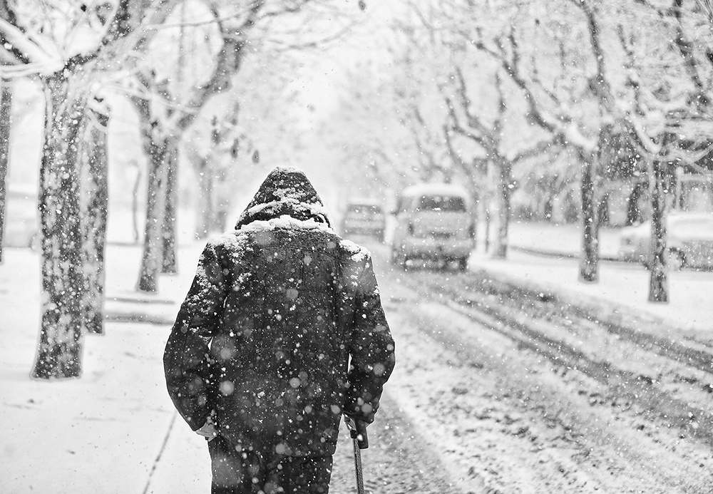 03 大连理工大学 背影.满天飞雪,一个老人,杵着拐杖,行走在雪天.
