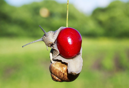 有趣的花园里的蜗牛挂在成熟的红浆果樱桃在害虫照片