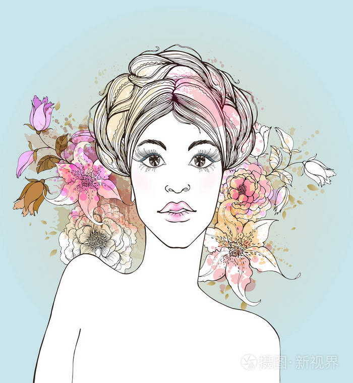 抽象矢量花卉头发元素的美女肖像插图