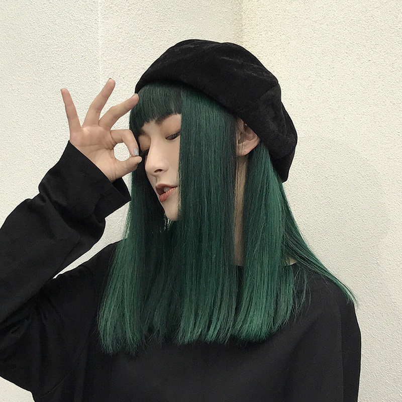 网红圆脸假发女长直发空气刘海中长发染黑墨绿齐发尾高温丝全头套