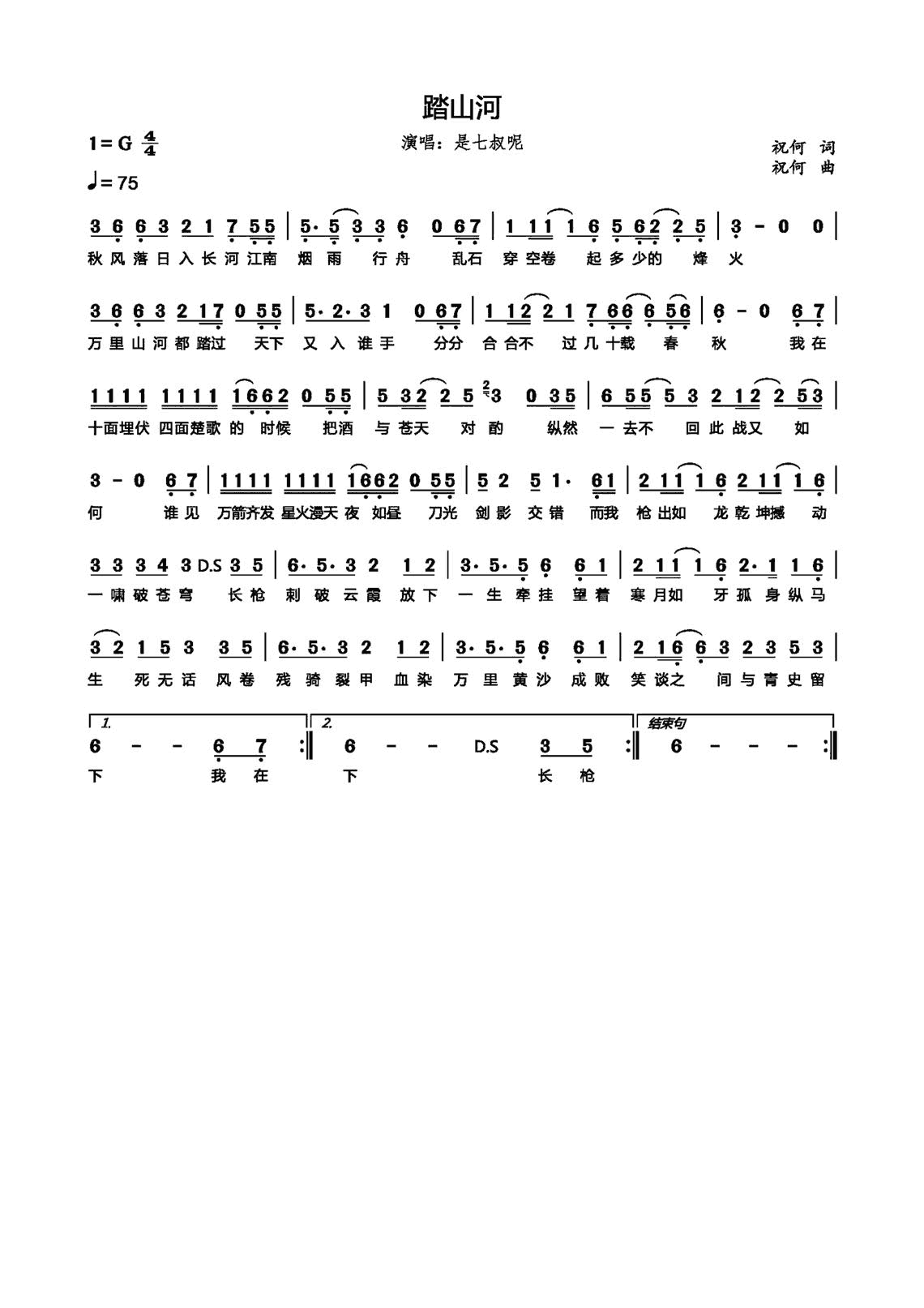 歌曲简谱是七叔呢踏山河免费高清歌谱简谱流行弹唱网