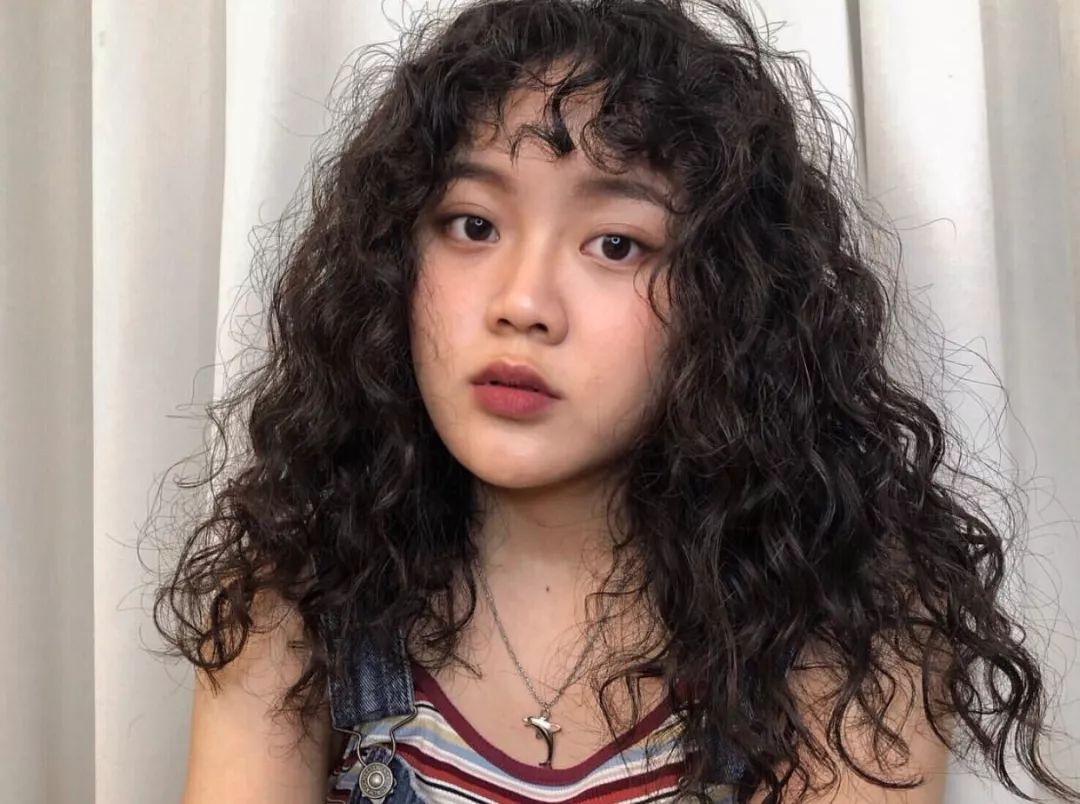 女生一头羊毛卷发型加上短短的狗啃刘海,显得很是