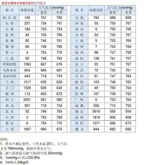 我国部分地区海拔高度和大气压及水和水蒸汽饱和状态表
