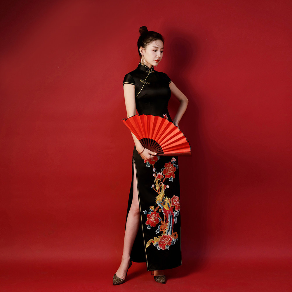古典风凤凰刺绣旗袍,复古红色斜襟开叉旗袍裙