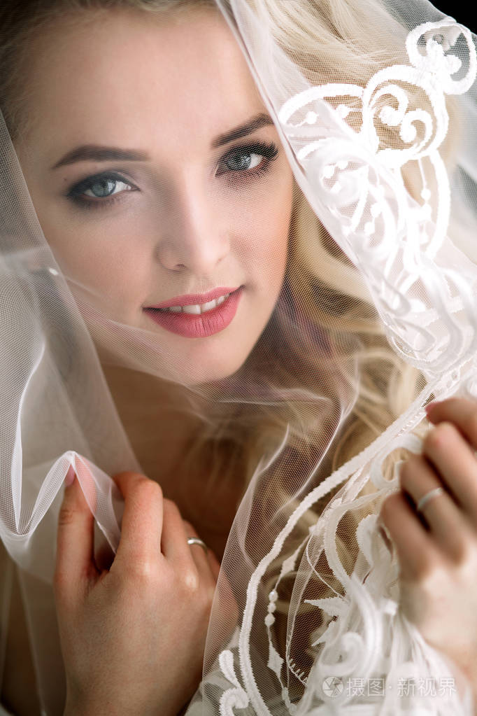 时尚和现代新娘, 美丽的金发女孩, 微笑与幸福和爱