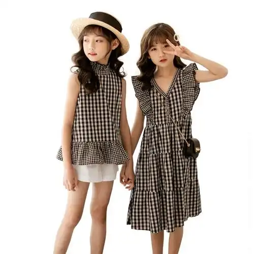 时尚新款荷叶边亲子姐妹装格子小清新韩版女童连衣裙夏季套装短袖