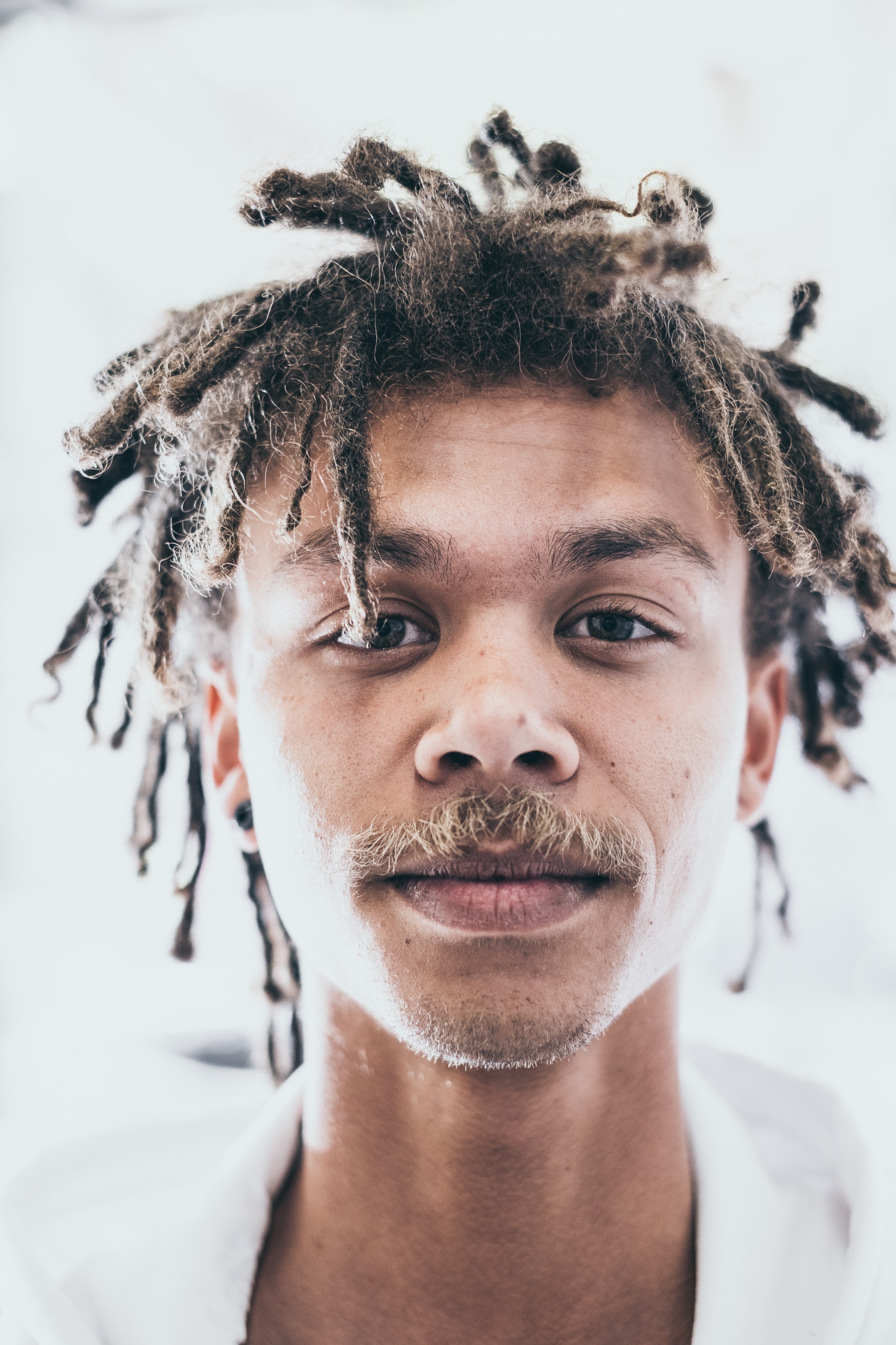 酷,年轻,黑色,人,特写,头像,非洲式发型,微笑,白墙