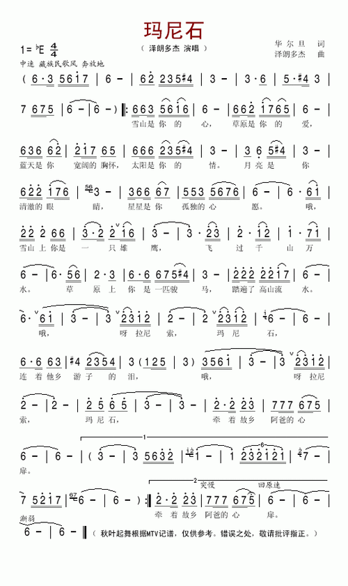 《玛尼石》唱谱,雪山是你的心草原是你的爱,蓝天是你宽阔的胸怀