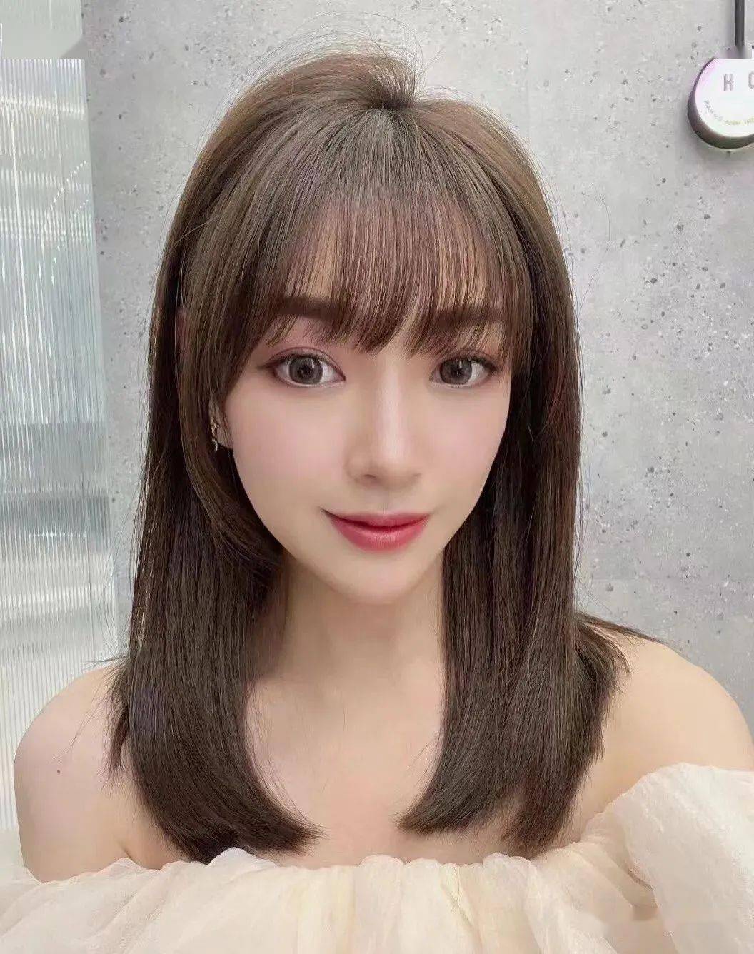 灵动自然,微斜刘海的黑色中长发直发发型,修饰小巧脸型的同时更显清纯