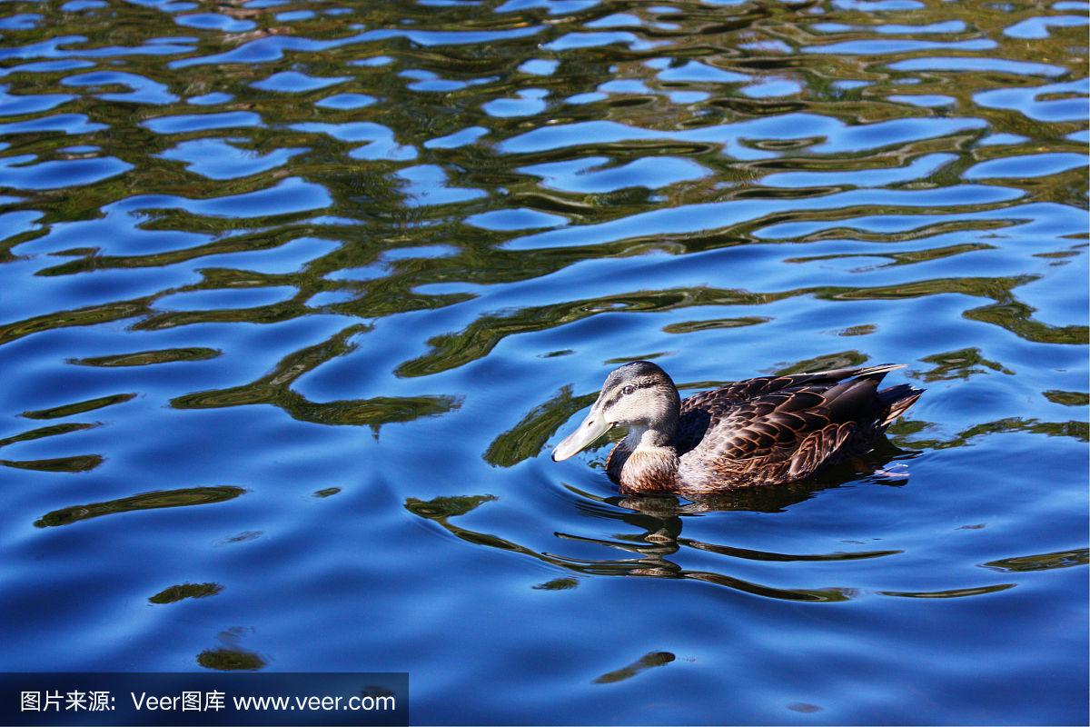 小鸭子慢慢地漂浮在平静的蓝色湖面上