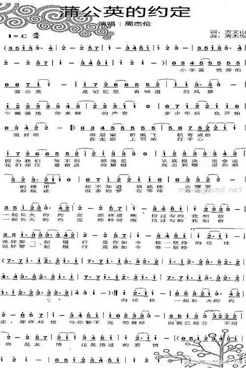 蒲公英的约定 钢琴谱 双手简谱 电子版 独奏 周杰伦 c调 数字谱