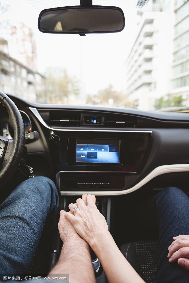 摄图新视界>照片>浪漫的情侣在车里牵手.情人还是新婚.