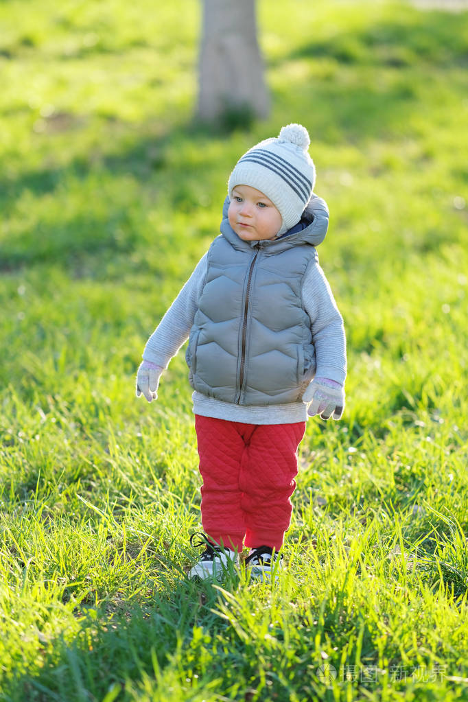户外保暖背心夹克的幼儿肖像. 一岁的小男孩穿着背心夹克在公园草地.