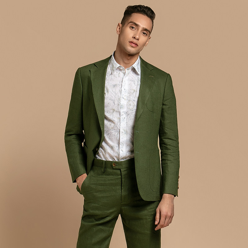 gievescharles春夏亚麻面料时尚修身绿色休闲男士西服套装