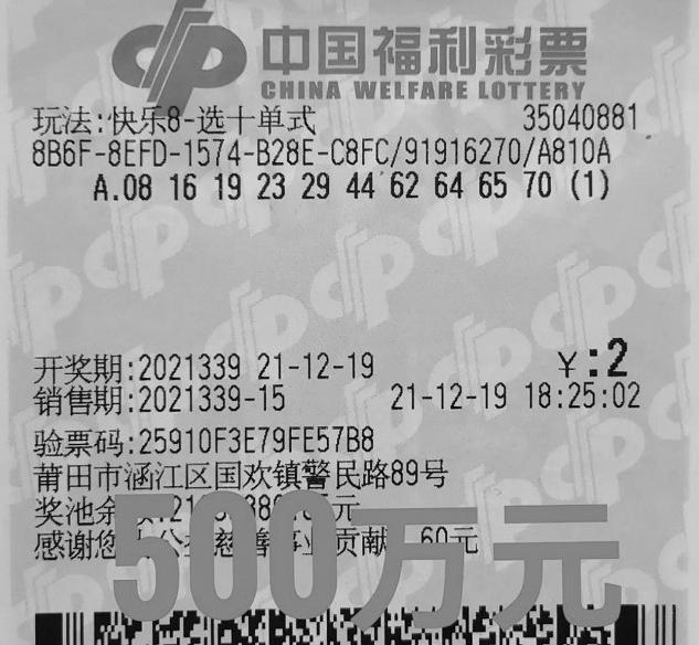 只花2元机选彩票 莆田彩民喜获快乐8游戏头奖