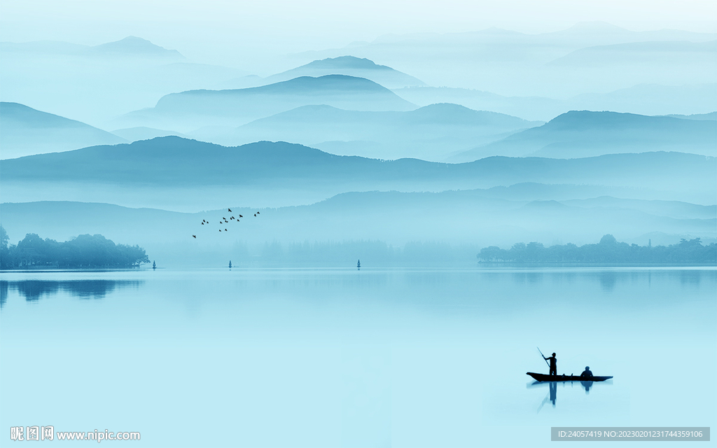 空灵意境山水风景蓝色写意背景墙