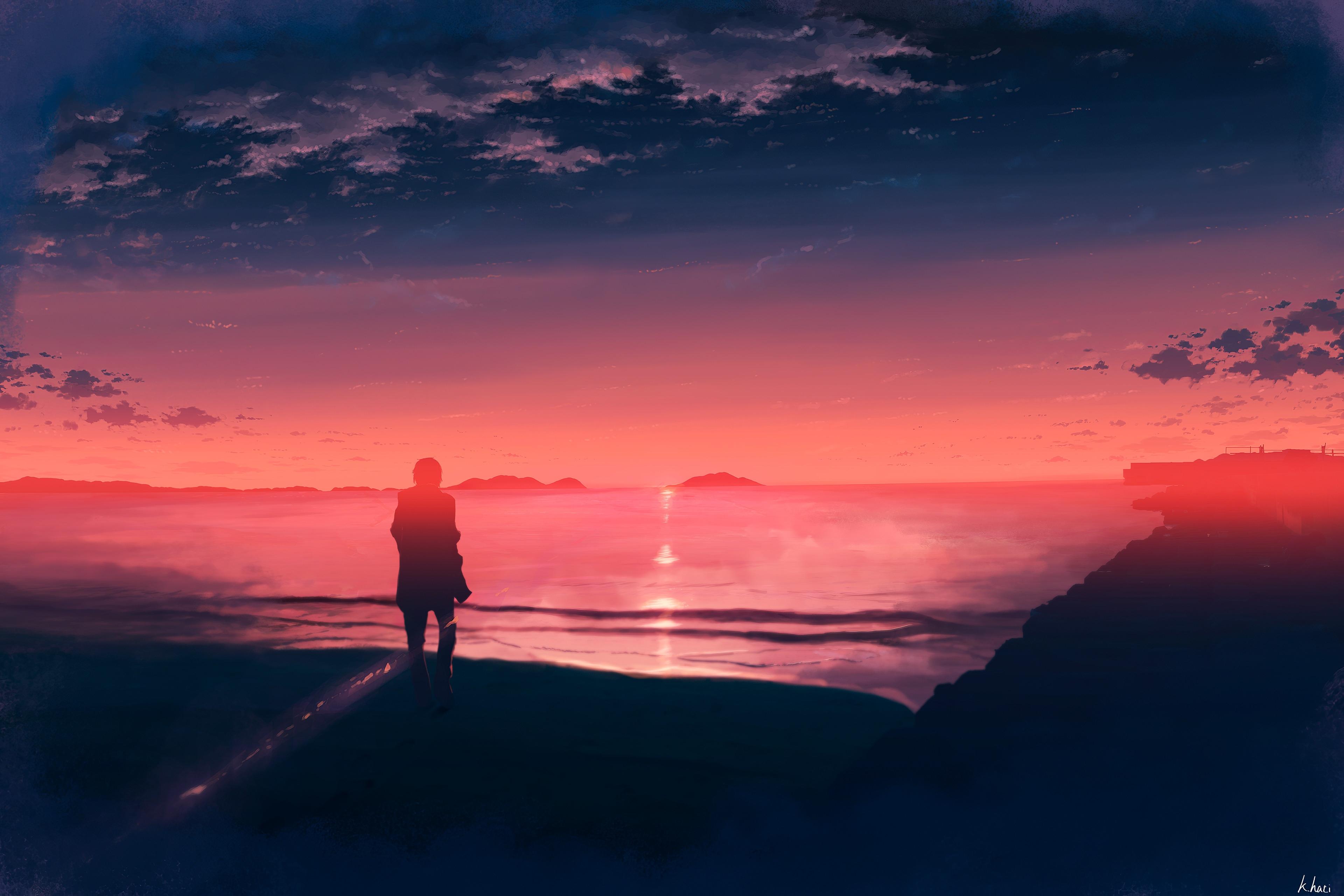 夕阳下一个人看海的孤独背影