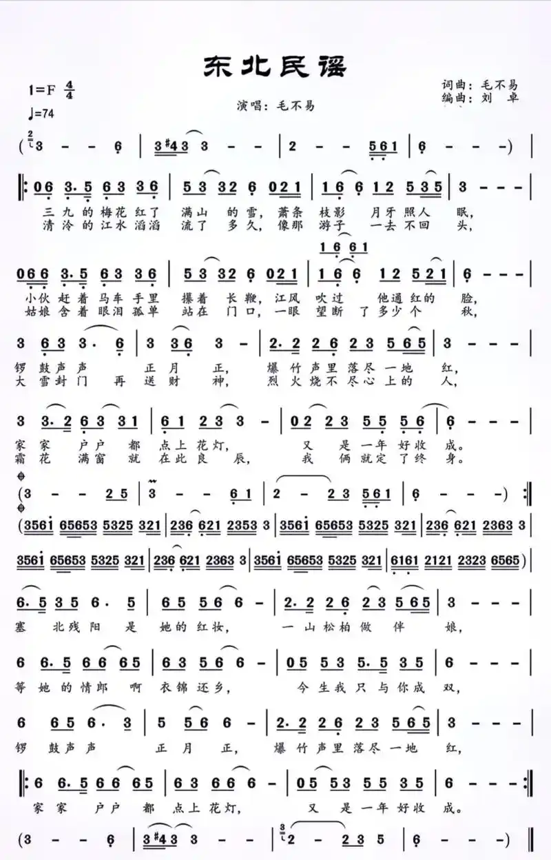 东北民谣毛不易简谱