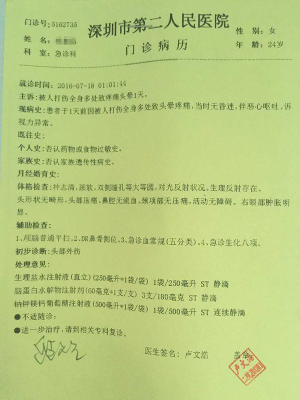 深圳市第二人民医院门诊病历显示,初步鉴定结果为头部外伤