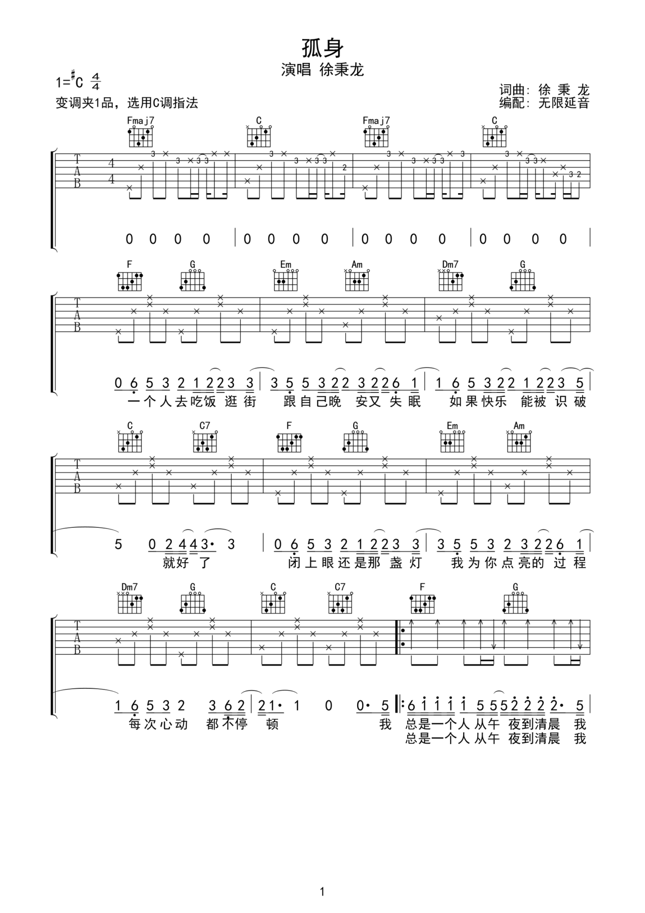 孤身吉他谱-徐秉龙-c调六线谱-高清版