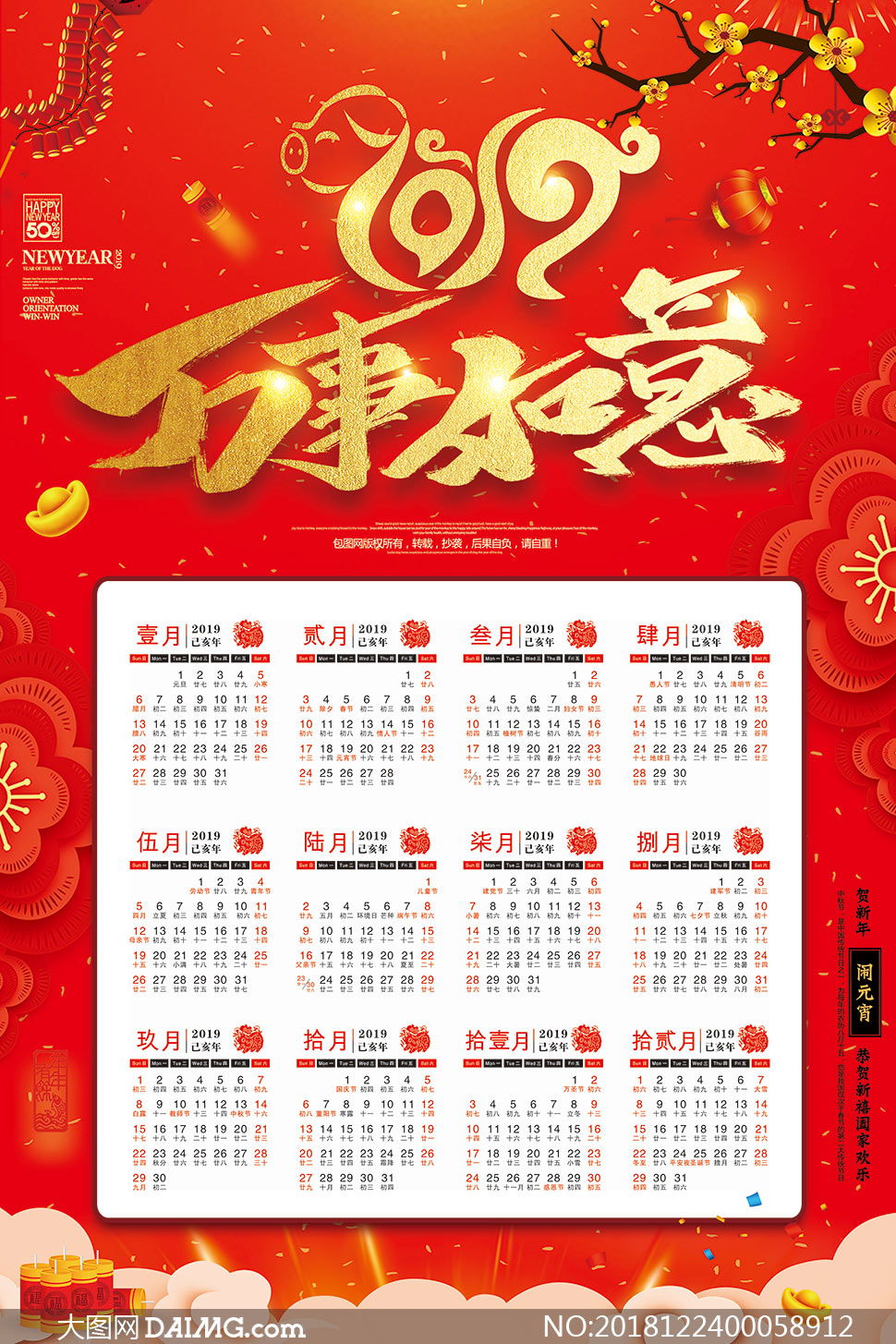 文欣月历 厂家供应马年新款礼品挂历 吉祥福字挂历