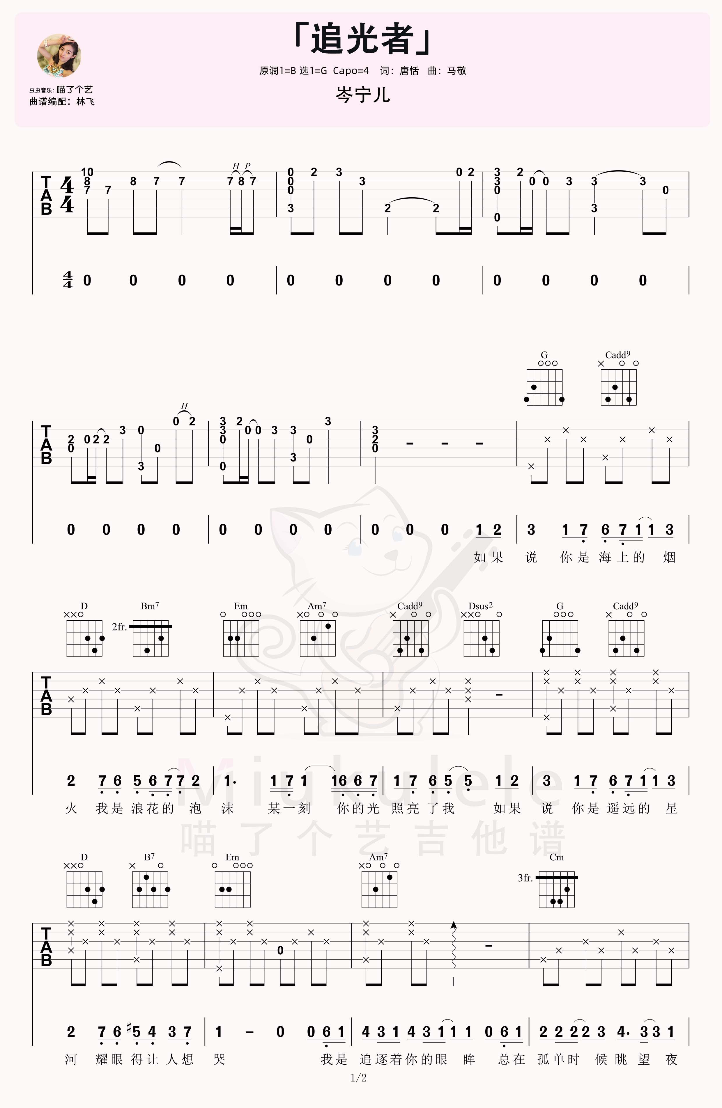 追光者 b调 岑宁儿b调六线吉他谱-虫虫吉他谱免费下载