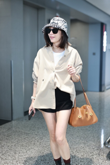 贾静雯机场街拍,卡其色衬衫搭配白色t恤,黑色短裤 短靴活力减龄!