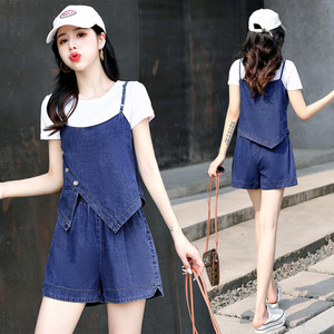 大码牛仔短裤两件套女2020夏装新款洋气显瘦减龄阔腿裤套装fl407