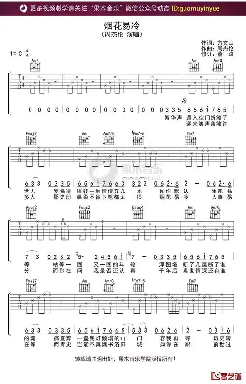 周杰伦《烟花易冷》吉他谱 c调弹唱六线谱1