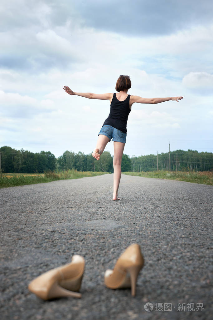 年轻的女孩赤脚走在路上她把鞋子落在路上忘记了夏天和旅行的概念