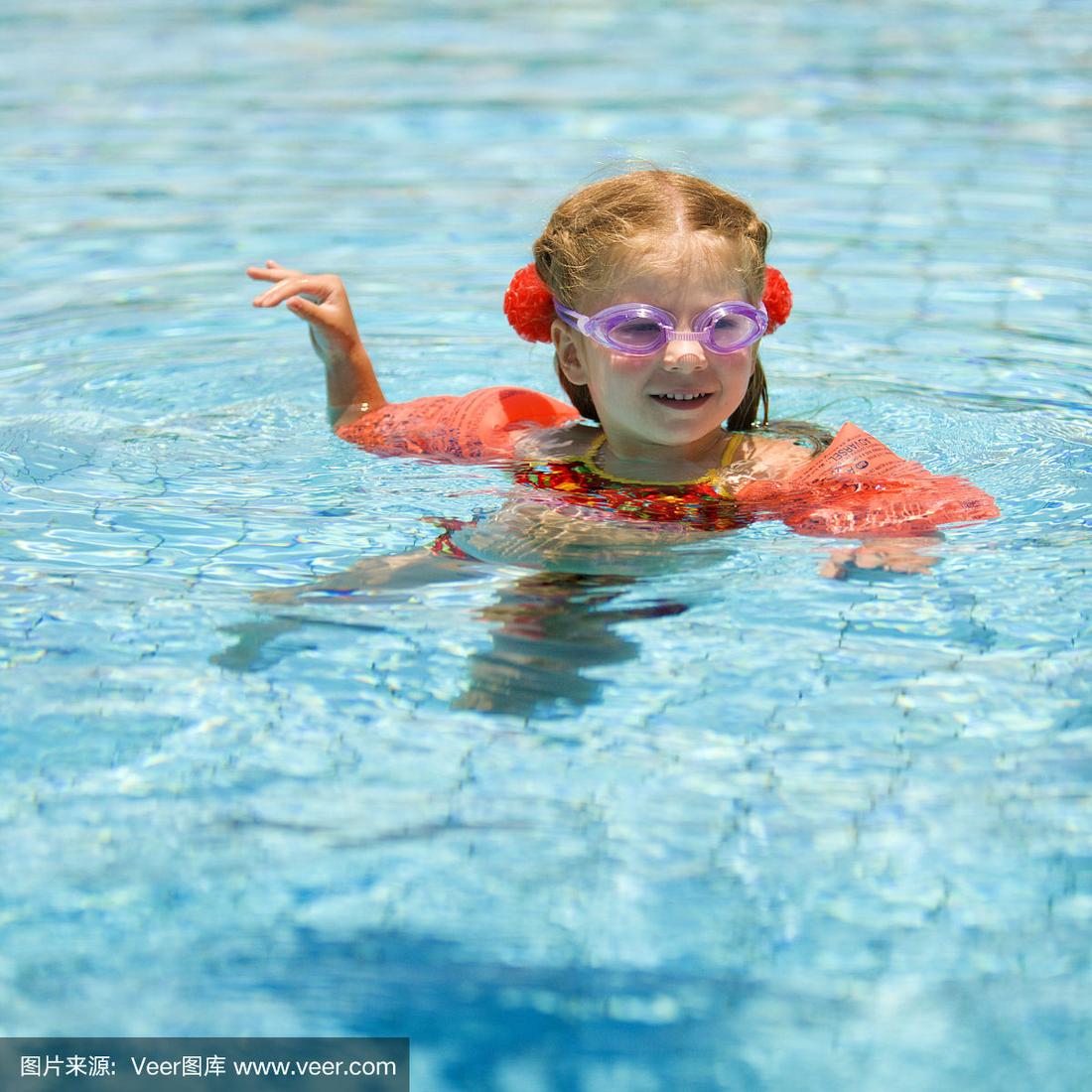 在池中的活动,在池中的活动.可爱的女孩游泳和玩水在游泳池中
