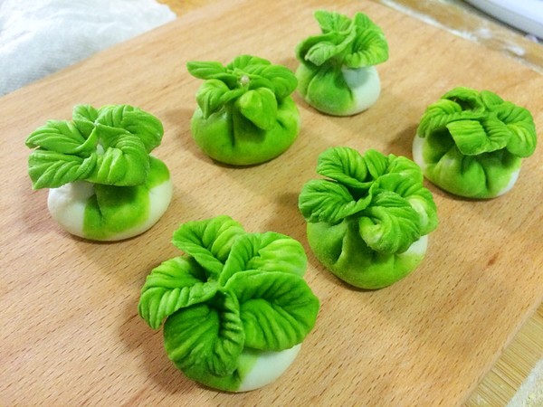 一根香菜铺底,然后摆放蒸好的五彩蒸饺,漂亮吧!