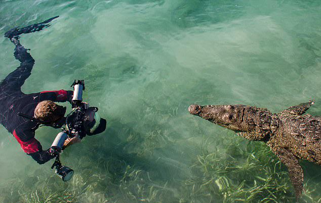 摄影师与三米巨鳄亲密接触 拍生动照片