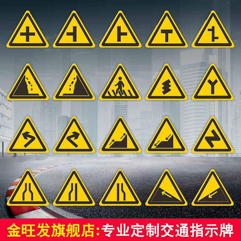 交叉路口三角交通牌连续弯路标志牌两侧变窄道路指示牌连续上下坡警示