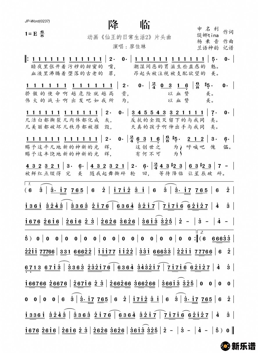 歌曲降临(动画《仙王的日常生活2》片头曲)的简谱歌谱下载