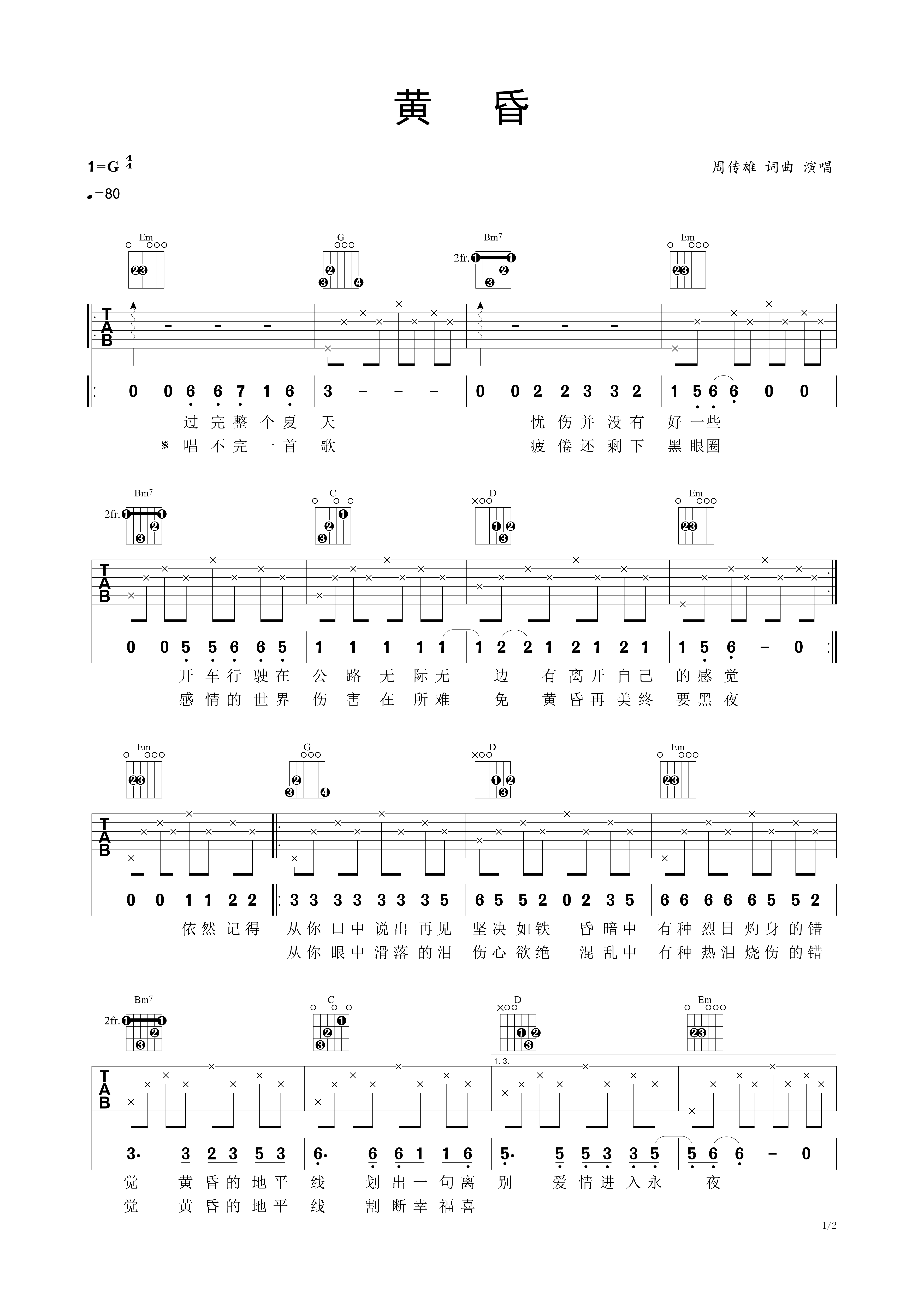 >>黄昏 民谣吉他弹唱谱 周传雄