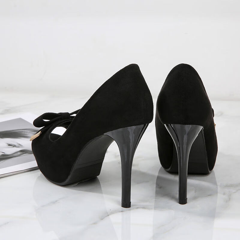高跟鞋女韩版尖头细跟防水台高跟鞋10cm浅口黑色女单鞋 黑色【绒面】