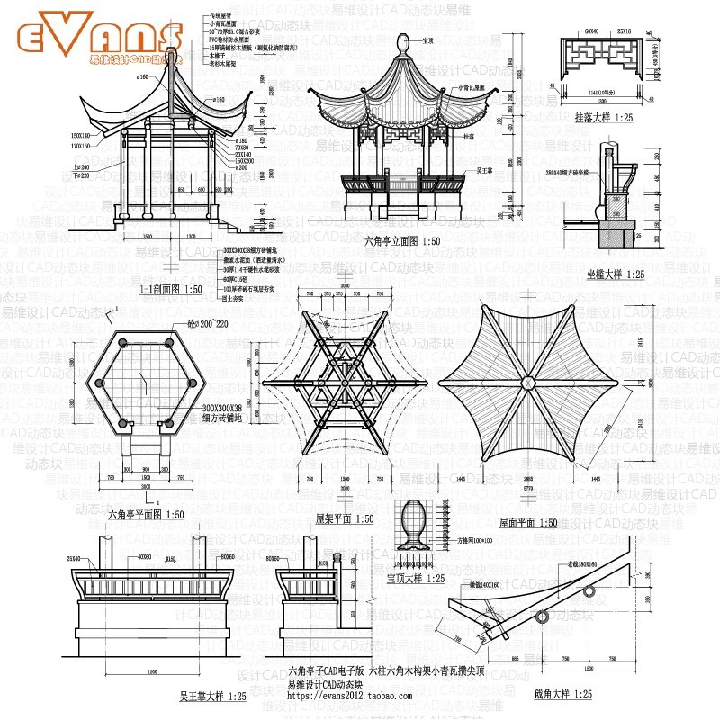 六角亭子cad文档电子版精品六柱构架尖顶平立2d